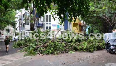 Photo Caption : A tree which was uprooted at Channamanakere Acchukattu, Banashankari, due to last night heavy rainfall in the City, in Bengaluru on Monday 3rd June 2024