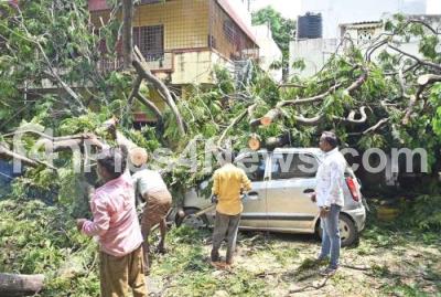 Photo Caption : A huge tree which was uprooted at Mahalakshmi Layout, due to last night heavy rainfall in the City, in Bengaluru on Monday 3rd June 2024