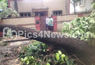 Photo Caption : A huge tree which was uprooted at Hanumantha Nagar, due to last night heavy rainfall in the City, in Bengaluru on Monday 3rd June 2024