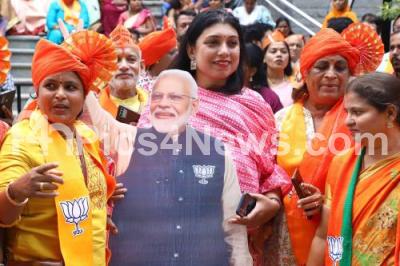 Photo Caption : BJP supporters celebrating Lok Sabha elections results at State BJP office, in Bengaluru on Tuesday 4th June 2024