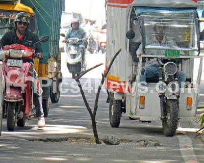 A tree branch being kept on a pothole at Museum Road and has been causing major inconvenience to people and motorists, in Bengaluru on Wednesday 5th June 2024