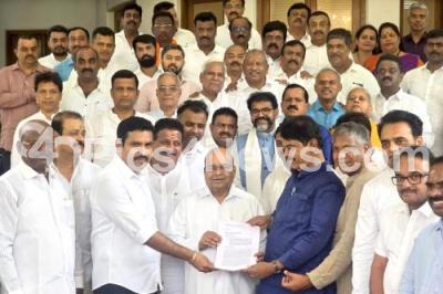 Photo Caption : BJP MLAs, MLCs led by State President BY Vijayendra submitting their memorandum to Governor Thawar Chand Gehlot regarding Minister Nagendra scandal in the Valmiki Corporation Board at Raj Bhavan, in Bengaluru on Thursday 6th June 2024
