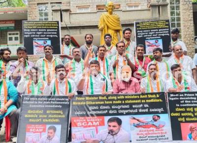 Photo Caption : Members of Bengaluru City Youth Congress protesting against Central NDA government and demanding cancel the NEET exam and give justice to NEET students, in Bengaluru on Tuesday 11th June 2024