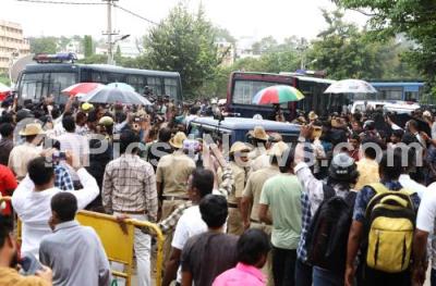 Photo Caption : Darshan fans gathered outside the Annapurneshwari Police station, actor Darshan arrested for alleged role in murder over obscene texts, in Bengaluru on Tuesday 11th June 2024