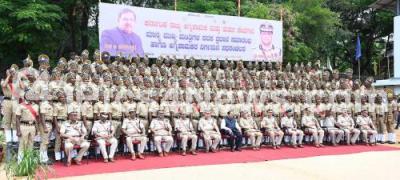 Event Description : Home Minister Dr. G Parameshwara with Kamal Pant, Director General of Police and Director General, Fire and Emergency Services and Fire Brigade Personnel group photo during Chief Ministers medal award ceremony and fire brigade march past at RA Mundkur Fire and Emergency Services Academy, in Bengaluru on Tuesday 11th June 2024