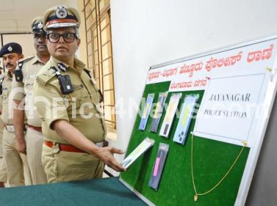 Photo Caption : Bengaluru City Police Commissioner B Dayananda inspects the recovered smartphones during a press conference on property parade at Commissioner of Police office , in Bengaluru on Tuesday 18th June 2024
