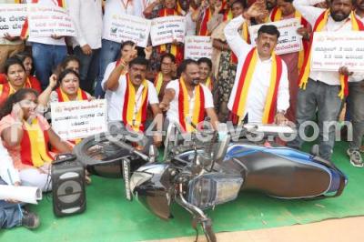 Event Description : Members of Kannadigara Vijayasene protesting against State Congress government for hike of fuel price in the Karnataka state, in Bengaluru on Tuesday 18th June 2024
