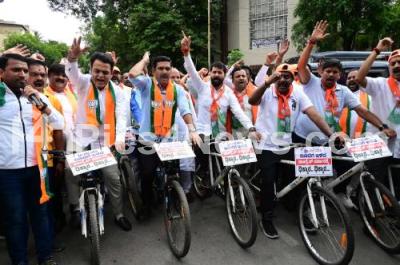 BJP state President BY Vijayendra with BJP leaders Ashwath Narayan, CT Ravi and others riding bicycles during their protest against State Congress government for hike of fuel price in the Karnataka state, in Bengaluru on Thursday 20th June 2024