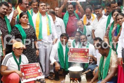 Photo Caption : Members of BJP Raitha Morcha protesting against state Congress government and hike in milk packet price, at Freedom Park, in Bengaluru on Saturday 29th June 2024
