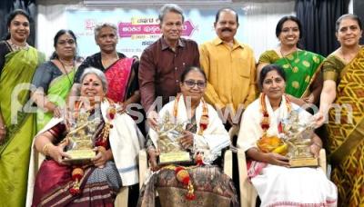 Photo Caption : Nadoja Prof. Baraguru Ramachandrappa presenting "Ankita Pustaka" award to Writers Bhanu Mushtaq, Dr. HS Anupama and Prathiba Nandakumar during the award program organised by Karnataka Women Writers Association at BM Shree Kala Bhavan, also seen are Dr. HL Pushpa, President, Karnataka Women Writers Association, Bharati Hegde, Manjula Shivnanda and others, in Bengaluru on Sunday 30th June 2024