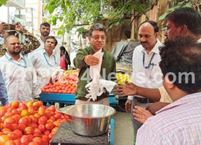 Event Description : BBMP Commissioner Tushar Girinath giving cloth bag to shop vendors and creating awareness to use cloth bag during International Plastic Bag Free Day, in Bengaluru on Wednesday 3rd July 2024
