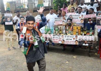 Members of Bengaluru City Youth Congress protest against BJP MP Dr. K Sudhakar and BJP leaders for distributing alcohol in his constituency and also alleging they looted money during COVID -19 at Congress Bhavan, in Bengaluru on Monday 8th July 2024