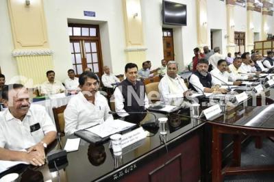 Chief Minister of Karnataka Siddaramaiah with DCM DK Shivakumar, BJP Opposition leader R Ashoka, Former Union Minister DV Sadananda Gowda and all party MLAs, MLCs, MPs during a meeting on Cauvery river issue at Conference Hall Vidhana Soudha, in Bengaluru on Sunday 14th July 2024