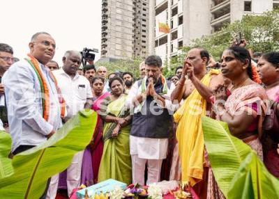 DCM DK Shivakumar performed guddali pooja to inaugurate the white topping of roads and footpaths, at Gandhi Nagar assembly constituency, also seen are Minister Dinesh Gundu rao and others, in Bengaluru on Monday 15th July 2024