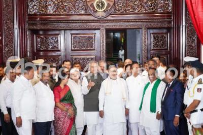 Photo Caption : CM Siddaramaiah with Speaker UT Khader, Council Chairman Basavaraj Horatti, Home Minister Dr. G Parameshwara, Minister HK Patil and others at the inauguration of renovation of Vidhana Soudha west gate assembly hall door, in Bengaluru on Monday 15th July 2024