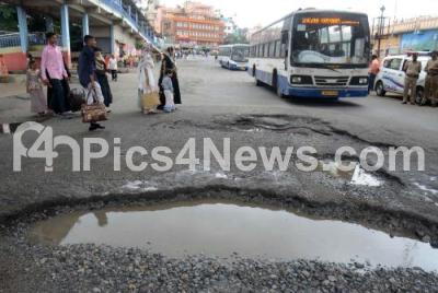 Photo Caption : A huge pot hole at Majestic creating problems for the commuters, in Bengaluru on Monday