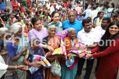 Photo Caption : Senior Actresses Tara Anuradha and Sudharani distributed blankets to poor people for the rainy season at Coxtown, in Bengaluru on Wednesday 17th July 2024