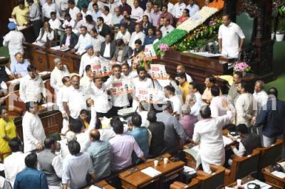 Photo Caption : BJP MLAs protesting against State congress government during the Assembly Session at Vidhana Soudha , in Bengaluru on Thursday 18th July 2024