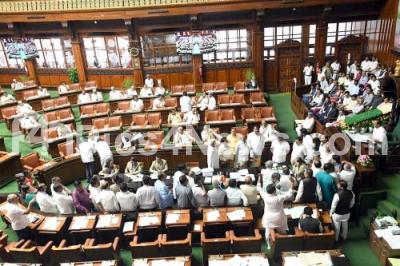 Photo Caption : BJP and JD(S) MLAs protesting against State congress government during the Assembly Session at Vidhana Soudha , in Bengaluru on Friday 19th July 2024