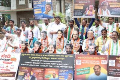 Photo Caption : Members of Bengaluru City Youth Congress protest and demanding immediate investigation against the corruption of BJP 21 scams, at Congress Bhavan, in Bengaluru on Saturday 20th July 2024