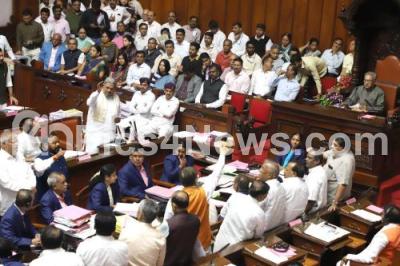 Photo Caption : Chief Minister of Karnataka Siddaramaiah arguing with BJP and JD(S) MLCs during the Council Session at Vidhana Soudha, in Bengaluru on Thursday 25th July 2024