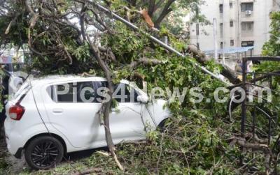 Photo Caption : A tree uprooted on cars at Queens Road due to strong winds, in Bengaluru on Saturday 27th July 2024