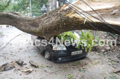 Photo Caption : A tree uprooted on cars at Queens Road due to strong winds, in Bengaluru on Saturday 27th July 2024