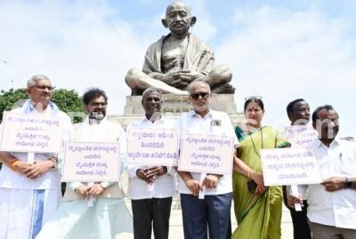 Photo Caption : BJP MLAs, MLCs staging a protest at Mahatma Gandhi statue, Vidhana Soudha, to protest against Chief Minister of Karanataka Siddaramaiah for his false allegation on BJP MP Kota Srinivas Poojari, in Bengaluru on Monday 29th July 2024