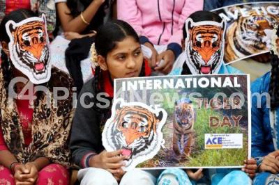 More than 250 school children celebrated World Tiger Day by donning paper masks resembling the face of a tiger as part of a tiger conservation campaign, in Bengaluru on Monday 29th July 2024