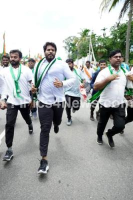 Photo Caption : JDS State Youth President Nikhil Kumarswamy runs with JDS members during the BJP and JDS alliance Mysuru Chalo Padayatra to protest against State Congress government MUDA and Valmiki scams, in Bidadi on Sunday 4th August 2024