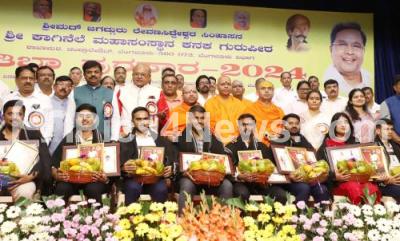 Photo Caption : Toppers being felicitated during the Pratibha Puraskar presentation program organised by Sri Kaginele Mahasamsthana Kanaka Gurupeeta, also seen are Shri Eshwarananda Puri, Sri Niranjanananda Puri, Former Minister HM Revanna and others, at Bunts Sangha, in Bengaluru on Monday 5th August 2024