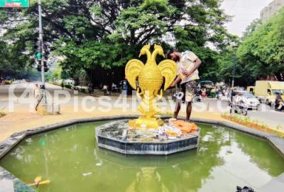 An artist gives final touches to two headed bird statue at police circle near Hudson circle, in Bengaluru on Thursday 8th August 2024