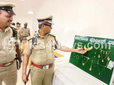 Photo Caption : Police Commissioner Dayananda inspects the recovered jewels during the property parade press conference at Police Commissioner Office, in Bengaluru on Friday 9th August 2024