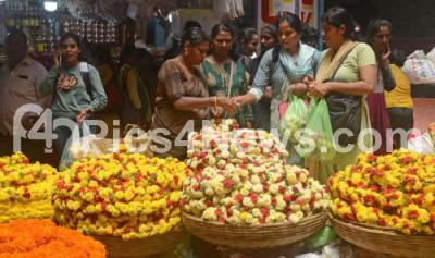 People buy flowers and fruits at KR market for the Varamahalakshmi Festival, in Bengaluru on Wednesday 14th August 2024