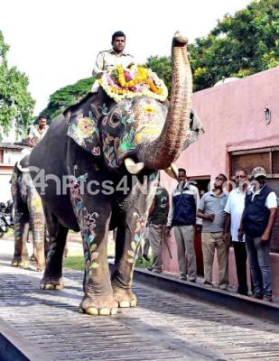 Event Description : Dasara elephants stand on the weighing scale to check weight, ahead of Mysuru Dasara jamboo savari procession, in Mysuru on Saturday 24th August 2024