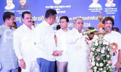 Photo Caption : Chief Minister of Karnataka Siddaramaiah with Ministers Madhu Bangarappa, MC Sudhakar and others during the Teachers Day celebrations at Vidhana Soudha, in Bengaluru on Thursday 5th September 2024