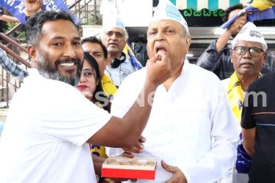 AAP leaders with State President Mukyamantri Chandru celebrate after Supreme Court grant bail to Delhi Chief Minister and party national convener Arvind Kejriwal in the alleged excise policy case, in Bengaluru on Friday 13th September 2024