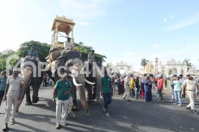 Event Description : Dasara elephants Jumbo savari rehearsal ahead of Dasara 2024 festival celebrations, in Mysuru on Tuesday 24th September 2024