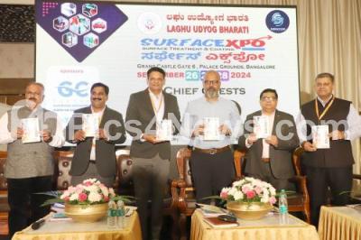 Photo Caption : Sachin Sabnis, President, Laghu Udyog Bharati with KB Kotresh, Regional Officer, KSPCB Davanagere (Retd), Sanjay P Bhat, President, Laghu Udyog Bharati and others during the inauguration of "Surfacexpo 2024" at Palace Grounds, in Bengaluru on Thursday 26th September 2024
