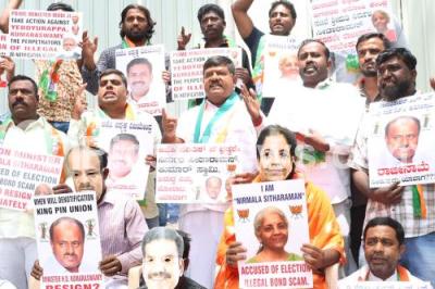 Photo Caption : Members of Bengaluru City Youth Congress protesting and demanding the resignation of Union Ministers Nirmala Sitharaman in Election Bond illegality and HD Kumarswamy in the de-notification scam, in Bengaluru on Saturday 28th September 2024
