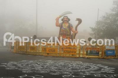 Photo Caption : Rangoli drawing in front of Mahishasura during the inauguration of 9 days Dasara festival at Chamundi Hill, in Mysuru on Thursday 3rd October 2024