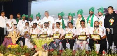 Photo Caption : Best farmers being felicitated by Ministers Cheluvaraya Swamy and K Venkatesh during the inauguration of Raitha Dasara (Farmers Dasara) as part of Mysuru Dasara festival celebrations, in Mysuru on Saturday 5th October 2024