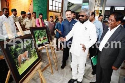Photo Caption : Forest Minister Eshwar Khandre looking at the wildlife photography exhibition during a program organized at Aranya Bhavan as part of the 70th Wildlife Week, in Bengaluru on Monday 7th October 2024