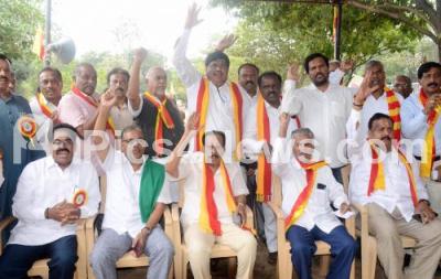 Photo Caption : Kannada Activists Janagere Venkataramaiah with Sa Ra Govind, CK Ramegowda and others during the protest meeting on Oppose the central government language policy at Freedom Park, in Bengaluru on Wednesday 9th October 2024