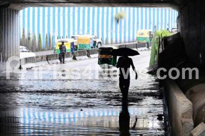 Photo Caption : People wade through rainwater logged road at Okalipuram Underpass, in Bengaluru on Tuesday 15th October 2024