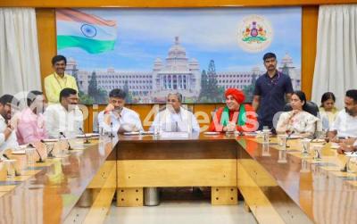 Photo Caption : CM Siddaramaiah with DCM DK Shivakumar, Kudala Sangam Panchamasali Peeth Basavajaya Mrityunjaya Swamiji, Ministers Lakshmi Hebbalkar, Shivraj Thangadagi, MLAs Vinay Kulkarni, Vijay Kashappanavar, community leaders, senior government officials during a meeting on Panchamasali community reservation at Chief Minister Home Office Krishna , in Bengaluru on Friday 18th October 2024