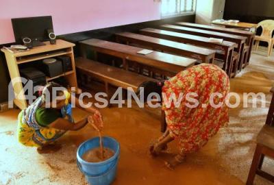 Photo Caption : Workers clearing the rain water logged in class rooms at Government School at Srinivasa Colony, due to heavy rainfall in Bengaluru on Sunday 20th October 2024