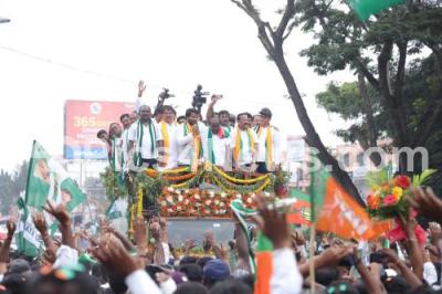Channapatna Assembly by-poll NDA Candidate Nikhil Kumarswamy during the road show before filing his nomination for the by-poll also seen are Union Minister HD Kumaraswamy, BJP leaders DV Sadananda Gowda, Ashwath Narayana, R Ashoka and others, in Channapatna on Friday 25th October 2024