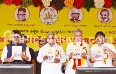 Photo Caption : Chief Minister of Karnataka Siddaramaiah released a book titled "Kannada Divige" with DCM DK Shivakumar, Council Chairman Basavaraj Horatti and Minister Madhu Bangarappa during the Kannada Rajyotsava celebrations at Kanteerava Stadium, in Bengaluru on Friday 1st November 2024