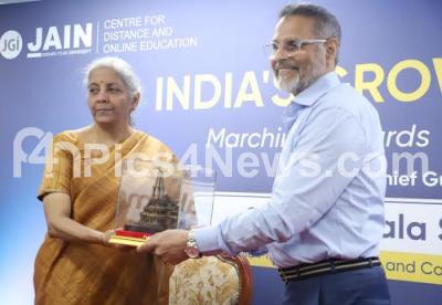 Photo Caption : Union Finance Minister Nirmala Sitharaman being felicitated Dr. Chenraj Roychand, Chancellor JAIN University during discussion program of Union Finance Minister with Students at Jain University, in Bengaluru on Saturday 9th November 2024
